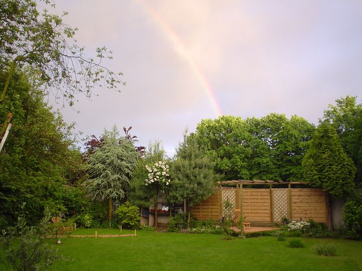 Die neue Holzterasse. Der Bereich fürs neue Gartenhaus ist links bereits abgesteckt.