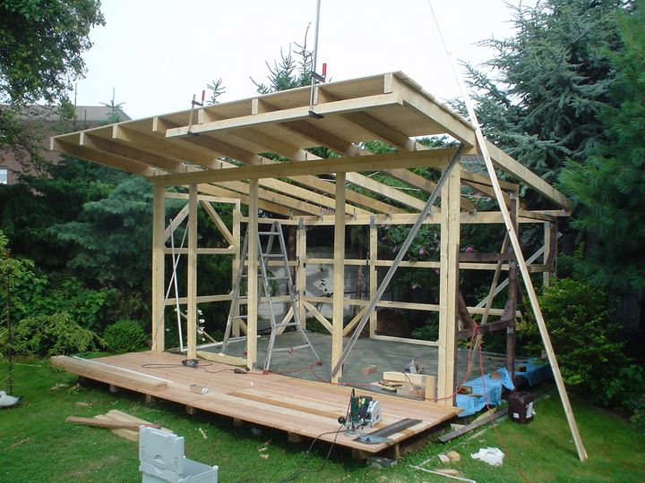 Wichtigstes Projekt für 2004 ist der Bau des Gartenhauses. Das Dach wird gezimmert.