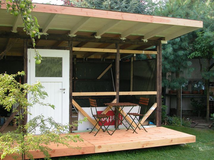 Wichtigstes Projekt für 2004 ist der Bau des Gartenhauses. Die Holzterasse vor dem Haus ist fertig.