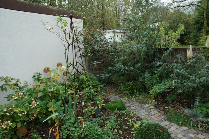 Die neu angelegte Sackgasse. Die Rose Eden am Rankgerüst muss sich noch von zwei Umpflanzaktionen erholen.