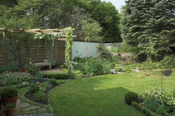 Der Blick vom neuem Gartenhaus in Richtung Teich.