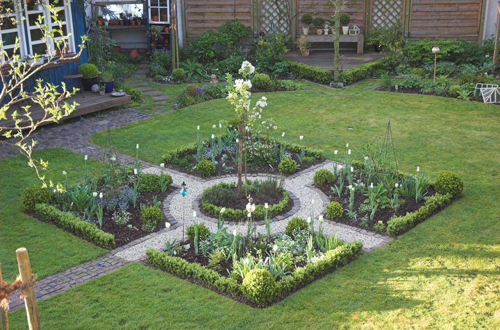 Der Bauerngarten aus der Sicht vom Gartenzimmer. Der Grasweg ist bereits durch einen feinen Kiesweg ersetzt worden.