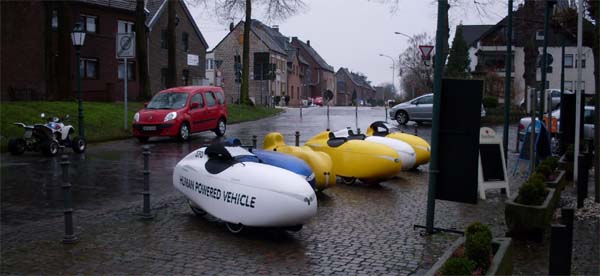 Um 8:00 Uhr werden die Velomobile bepackt und schnell zum Aufbruch geblasen. Noch ist es trocken, aber so soll es nicht lange bleiben.